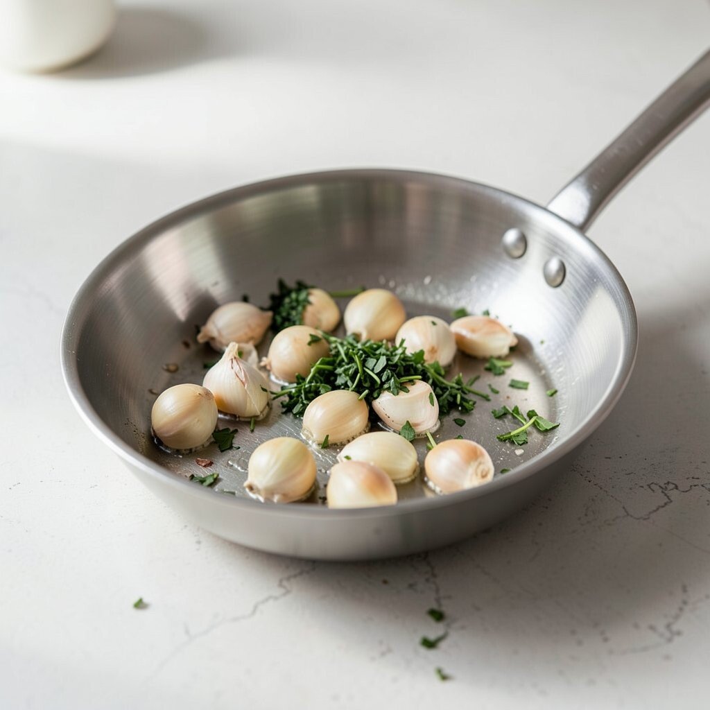 Heat the pan and add a drizzle of olive oil. Toss in the garlic and herbs, stirring gently to infuse the oil with flavor.
