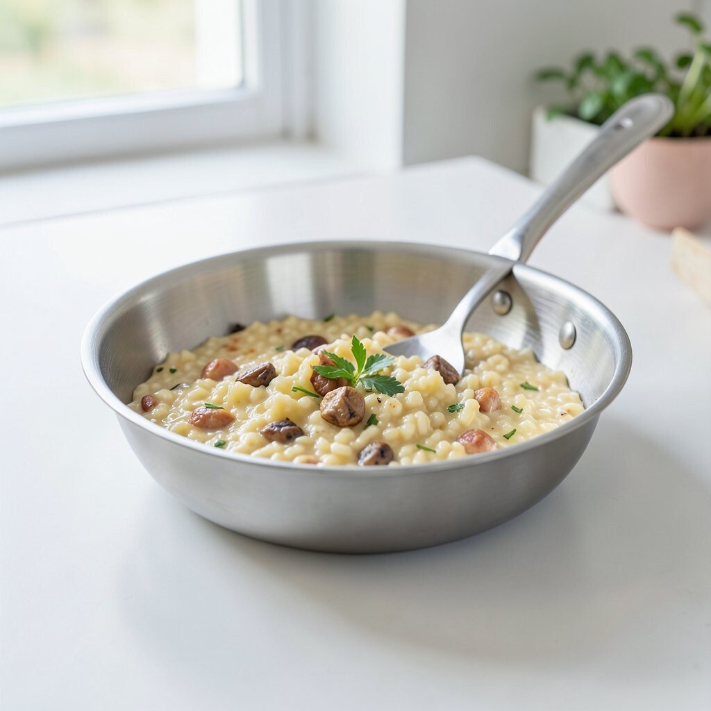 A creamy risotto is easily achieved with a stainless steel pan. Its ability to evenly distribute heat is essential for the gradual addition of broth.
