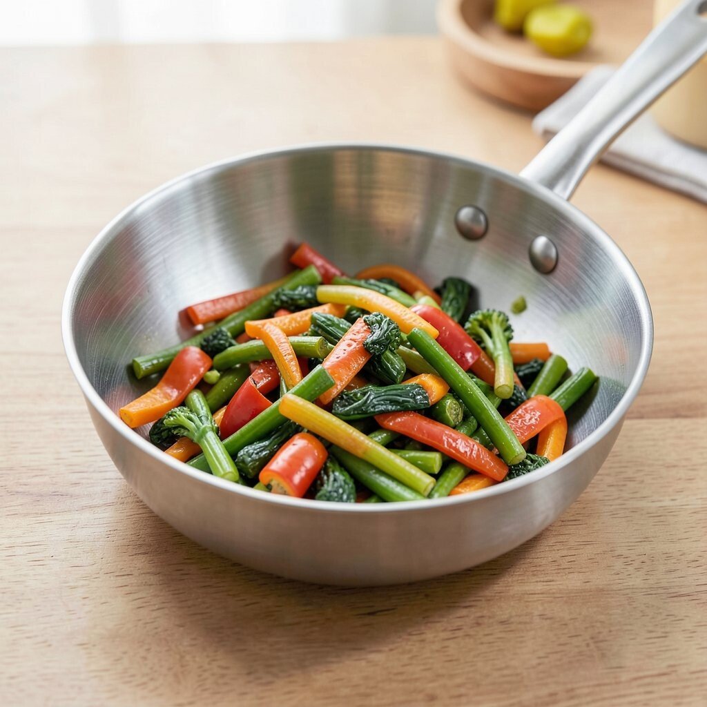 Stainless steel pans excel at stir-frying vegetables due to their even heat distribution. They allow the vibrant colors of the vegetables to shine.