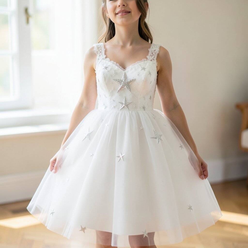 A white tulle star dress feels soft, sweet, and a little dreamy. Layers of tulle make it look airy, while star accents add a magical touch.
