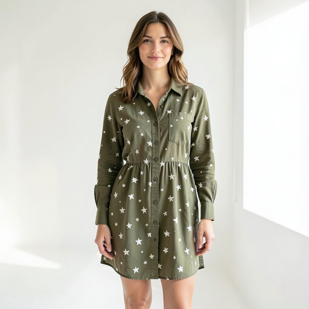 An olive star shirt dress gives a relaxed but still neat look. The shirt shape feels practical, and the olive color adds a natural, earthy mood.