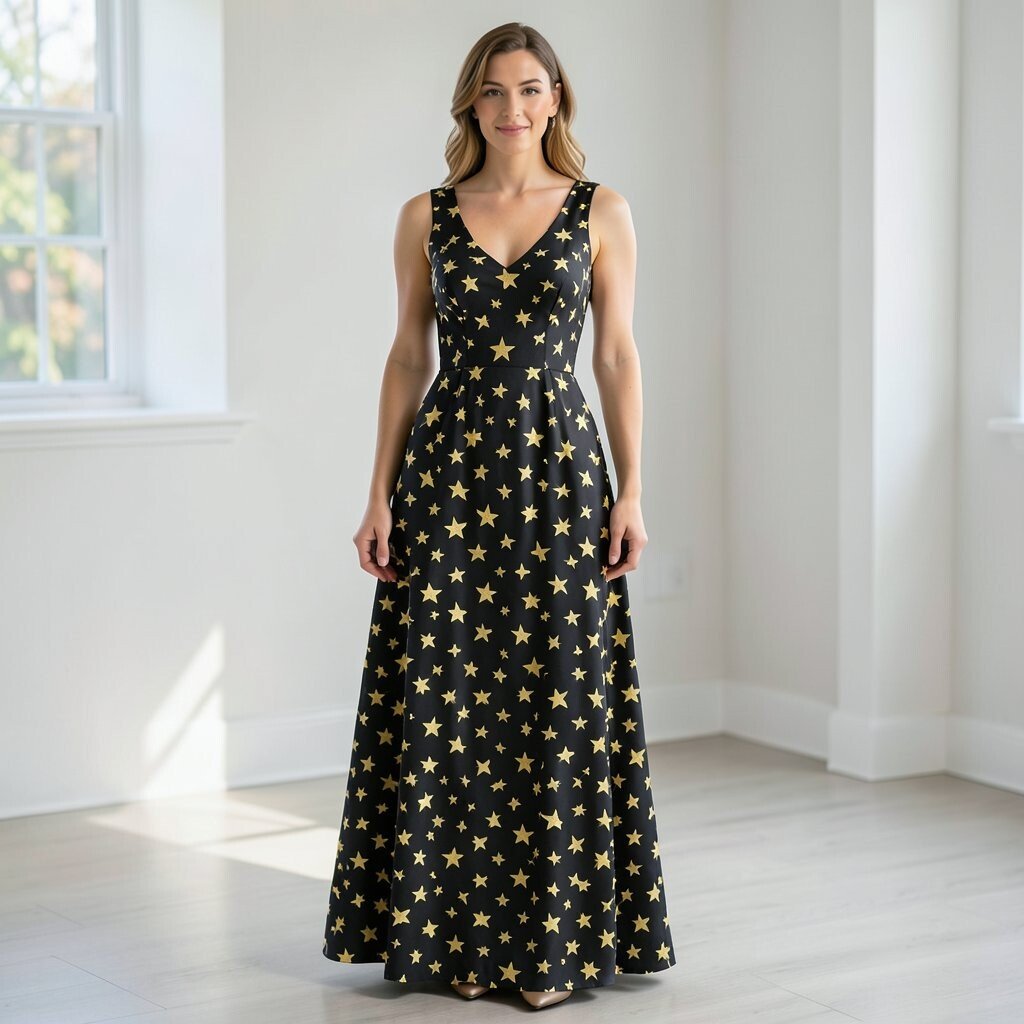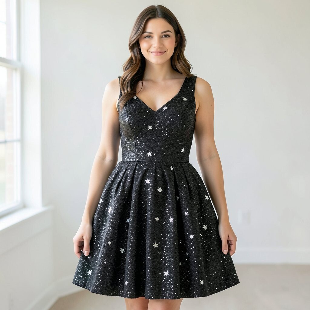 This is a great pick for someone who wants a modern look with a little mystery. It pairs well with boots, heels, or even a clean blazer, and it can be budget-friendly if you choose simple fabric with printed stars instead of heavy beading.