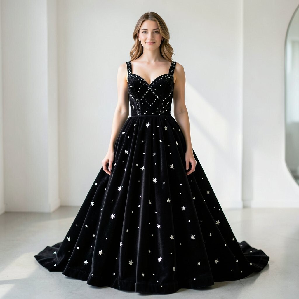A black velvet star gown feels dramatic in the best way. The long shape and soft fabric make it look graceful, while the stars add a little sparkle.