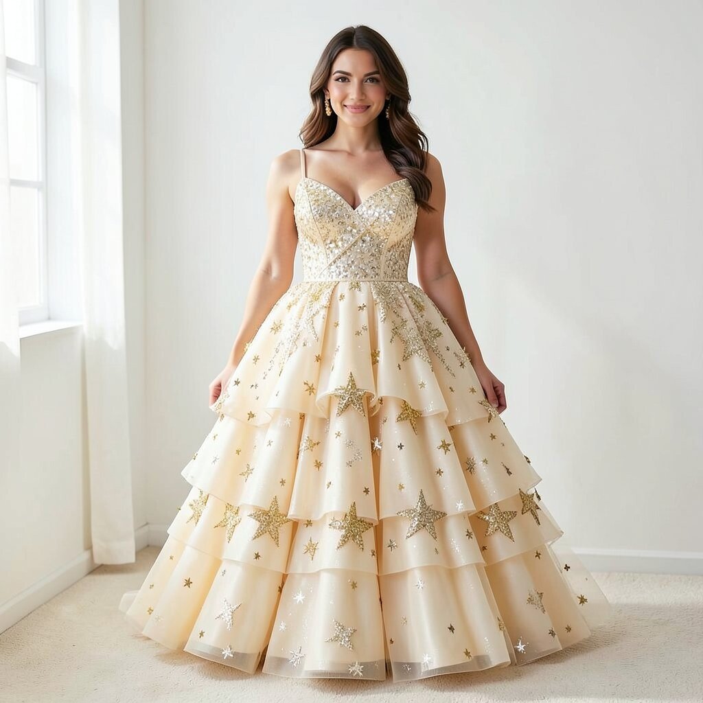 A champagne star layered dress feels soft, glowing, and fancy in a quiet way. The pale gold color looks warm, and the layers add lovely movement.