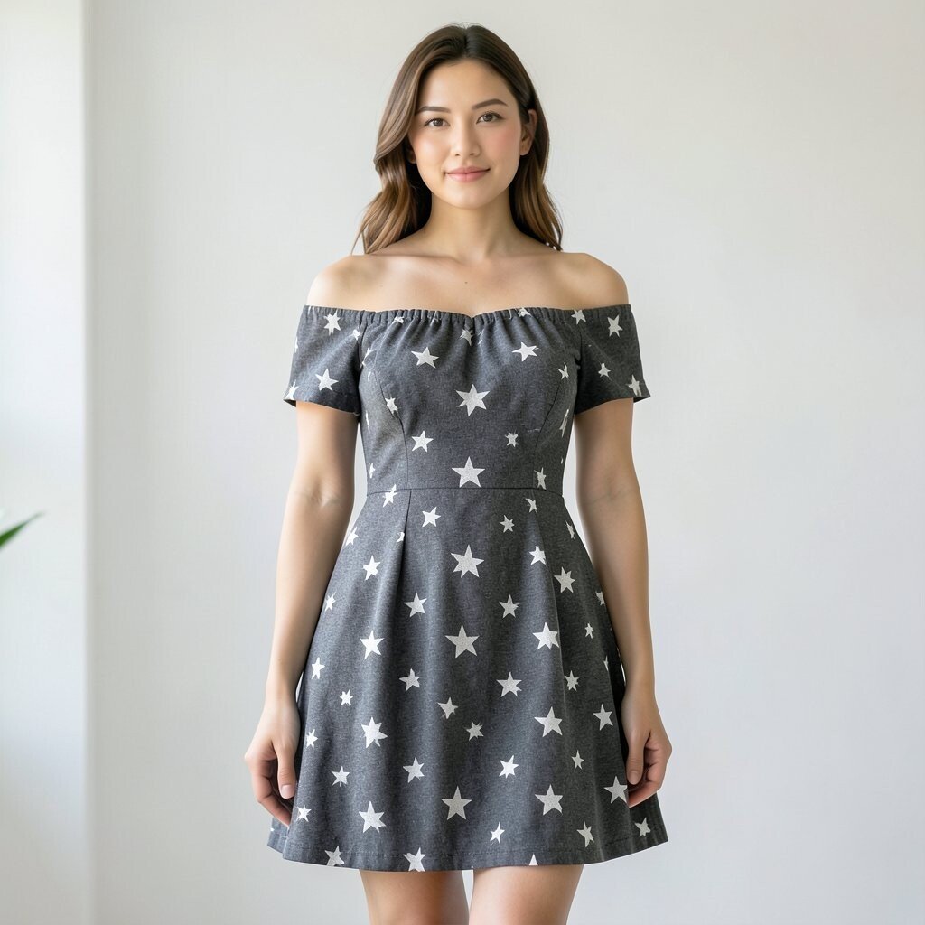 A charcoal off-shoulder star dress feels soft, stylish, and a little unexpected. The dark gray color is gentle on the eyes, and the neckline adds a pretty shape.