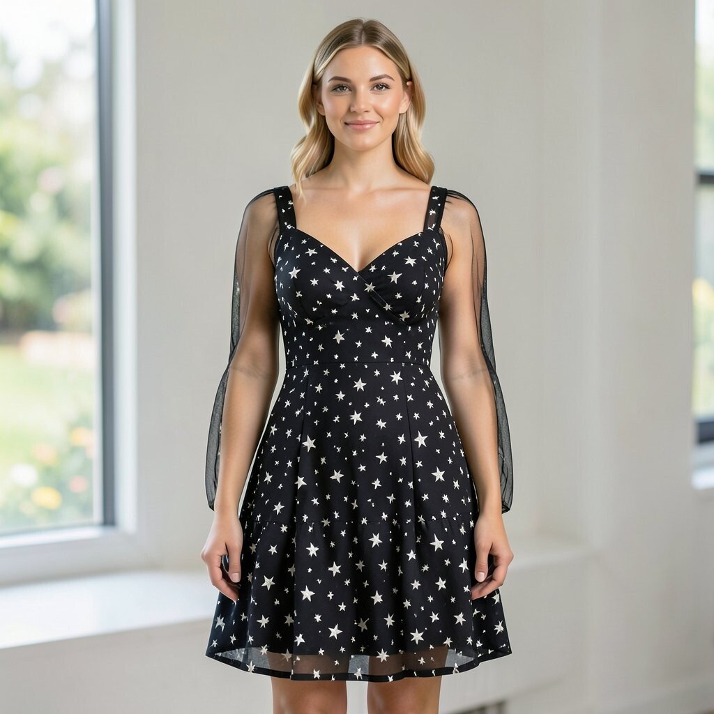 A black sheer sleeve star dress looks elegant and a little mysterious. The sheer sleeves add softness, while the star pattern keeps the dress playful.