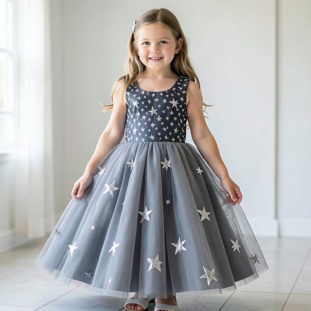 A gray tulle star party dress feels light, floaty, and a little magical. The gray color keeps it calm, while the tulle makes it look festive and fun.