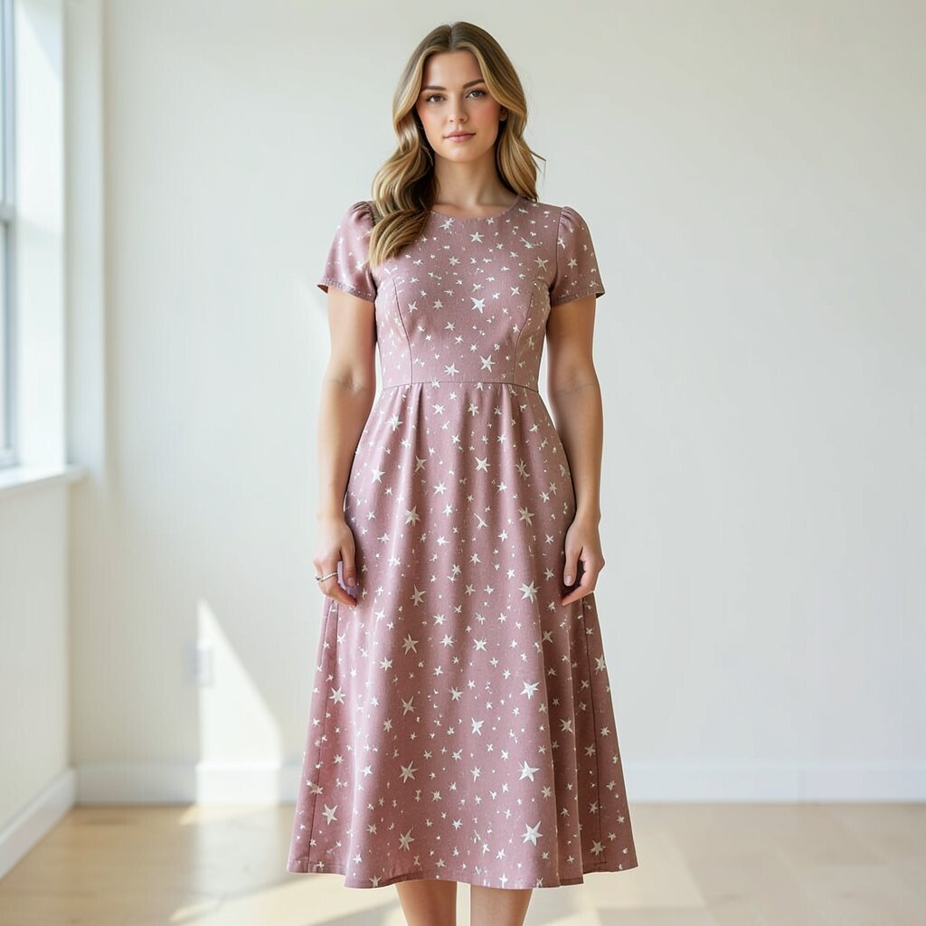 A dusty pink star midi dress feels soft, pretty, and a little romantic. The muted pink tone keeps it calm, while the stars bring in a fun twist.