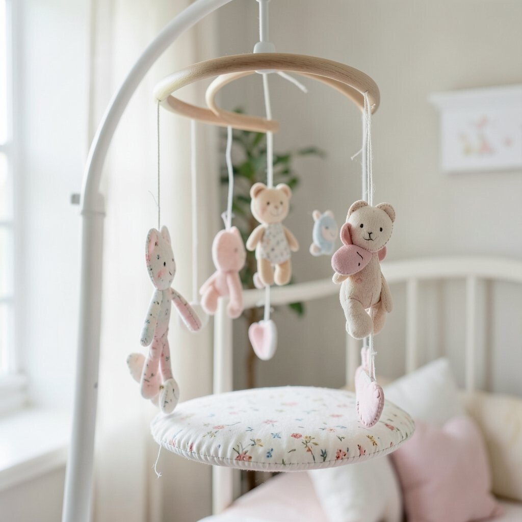 Stitch elements for a baby mobile. Use soft colors and gentle patterns to create a calming effect.