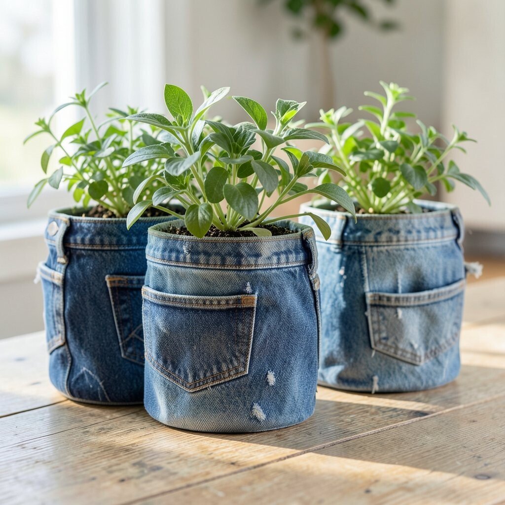 Turn old jeans into stylish planters! Cut and sew denim to fit plant pots, giving them a rustic, textured look.