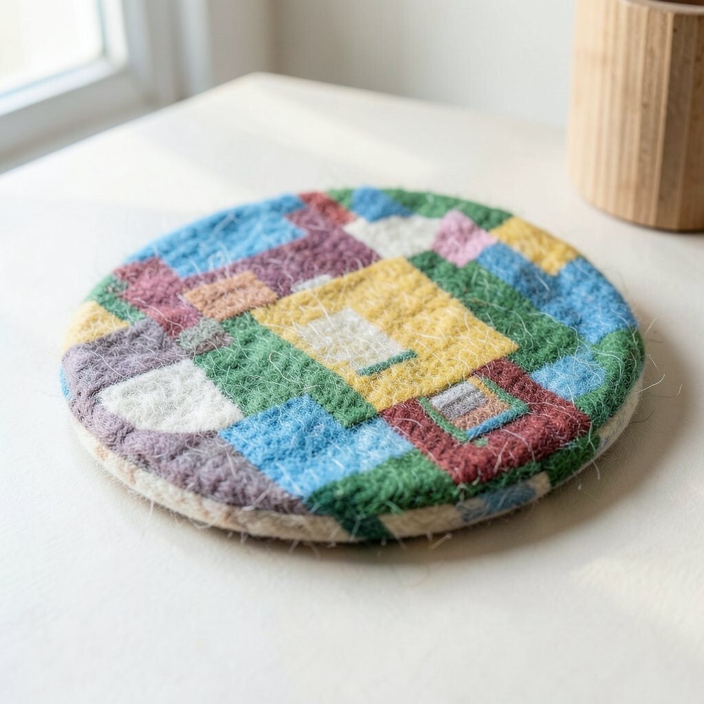 Create cozy felted wool coasters by felting wool roving. These coasters are both decorative and functional, protecting surfaces from hot or cold drinks.