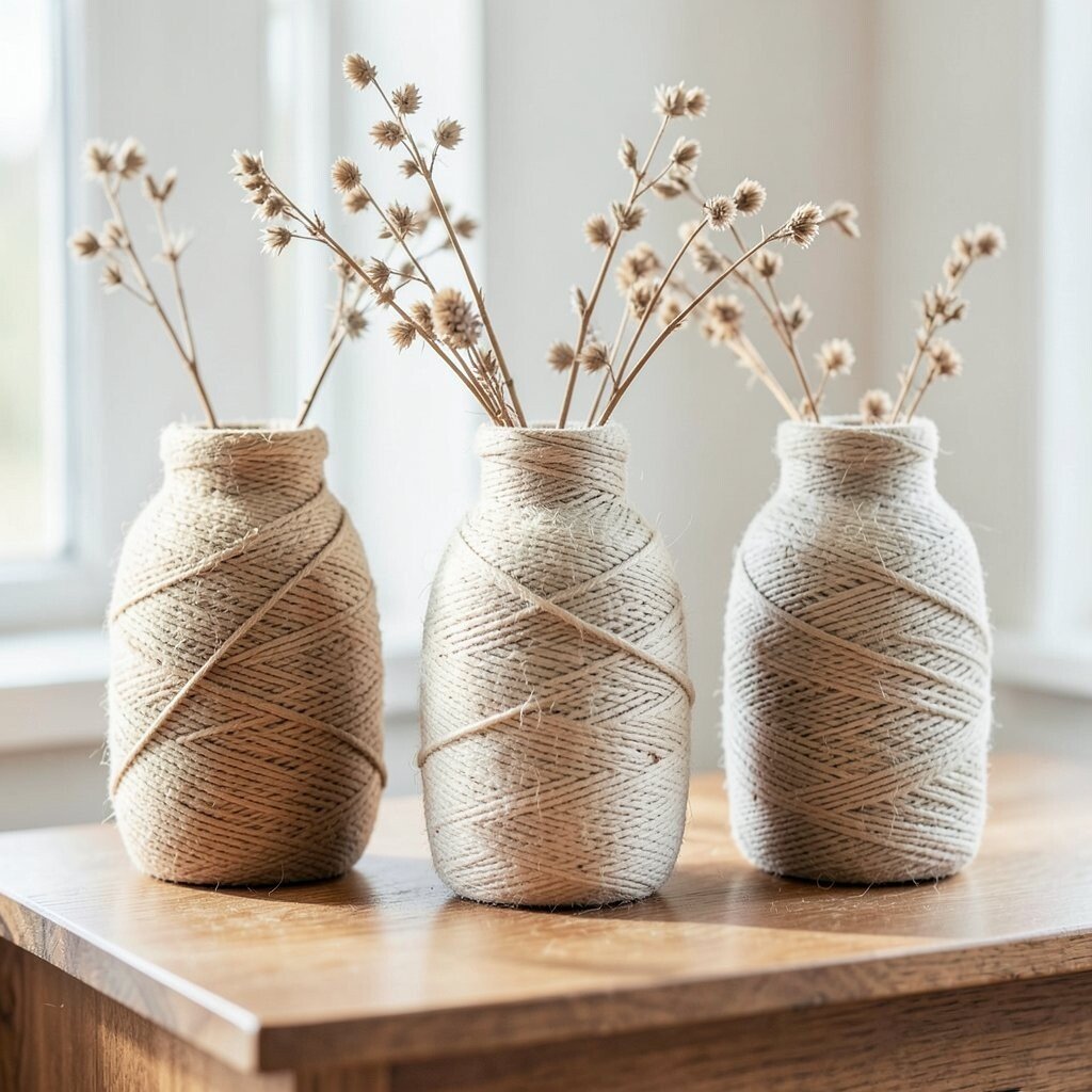 Wrap glass vases with colorful yarn to create textured, vibrant decor pieces. Secure the yarn with glue for a lasting effect.