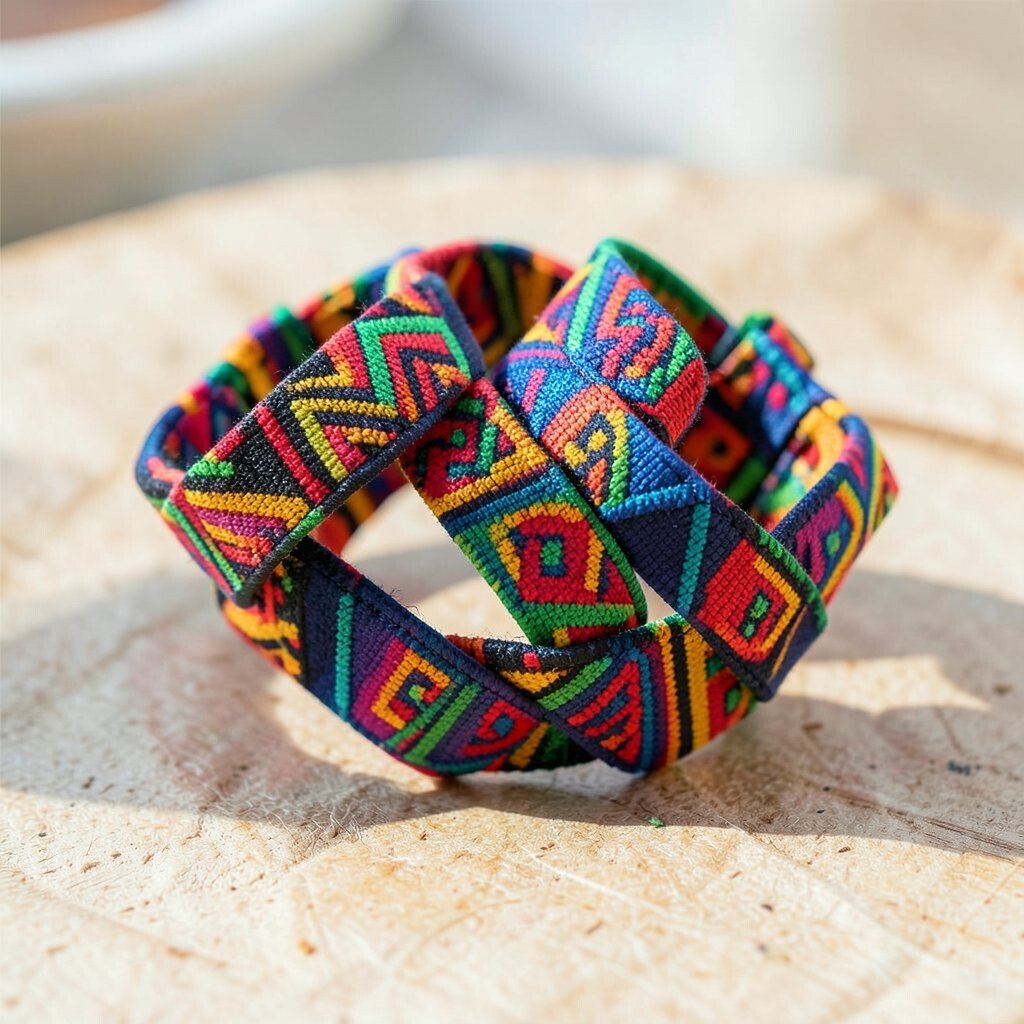 Inspired by tribal patterns, this woven bracelet adds an exotic flair to your outfit. The rich colors and intricate designs are eye-catching and tell a story of cultures and traditions. It’s a bold statement piece that suits anyone looking to stand out.