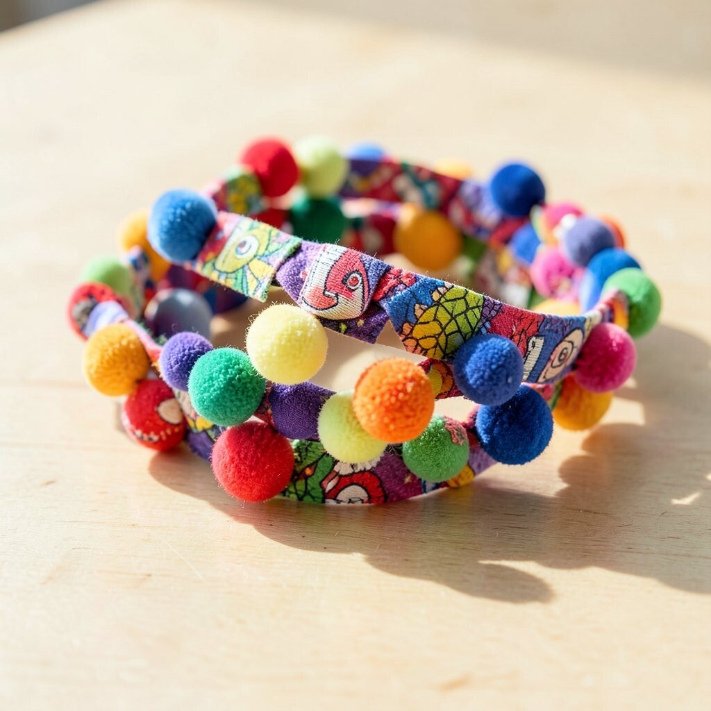 Bring the party to your wrist with this playful pom-pom bracelet. The colorful pom-poms add a touch of fun, creating a lively and whimsical look that’s perfect for festivals. It’s a statement piece that adds a touch of joy to any outfit.