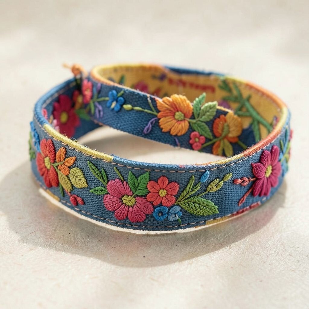 Embrace the beauty of nature with this floral embroidered bracelet. Each stitch is a work of art, capturing the essence of blooming flowers. It’s perfect for anyone who loves botanical themes and delicate designs.
