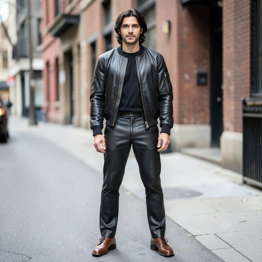 For an urban and trendy look, pair leather pants with a bomber jacket. This combination is perfect for streetwear enthusiasts and city dwellers. The bomber jacket adds a sporty and edgy touch to the outfit.