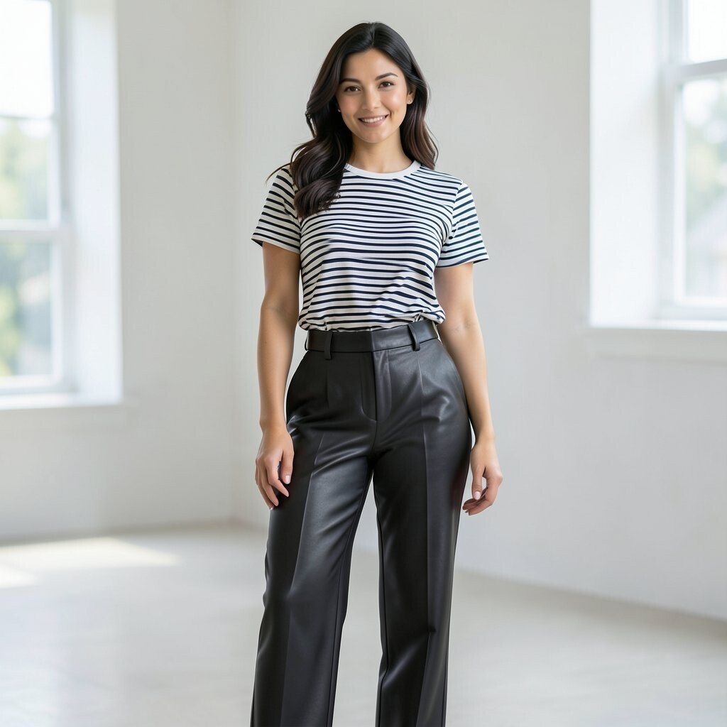 Add a fresh touch by pairing leather pants with a striped top. This is perfect for those who love a classic yet modern look. The stripes add visual interest and a playful element to the outfit.