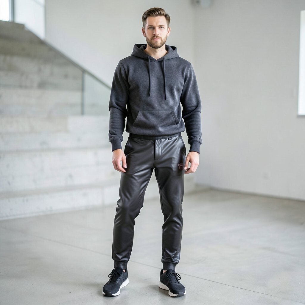 For a sporty and comfortable look, pair leather pants with a cozy hoodie. This is ideal for casual outings or travel days when comfort is key. The mix of sporty and edgy creates a unique and trendy aesthetic.