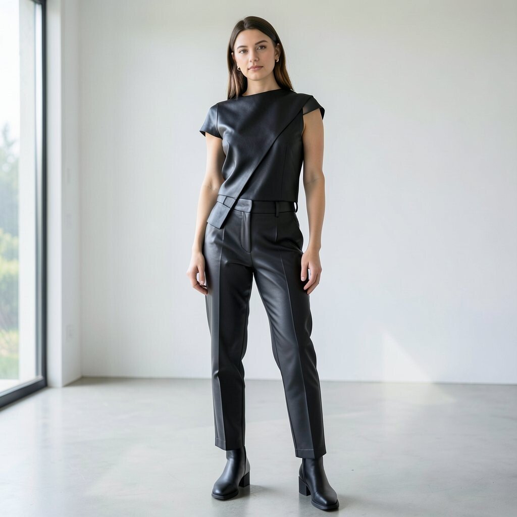 Complete the look with ankle boots and a simple top underneath. The monochrome effect is striking, and you can mix textures by choosing a jacket with studs or zippers. This outfit is a bit of an investment but totally worth it for the impact it makes.