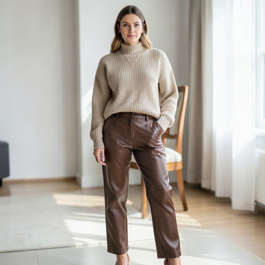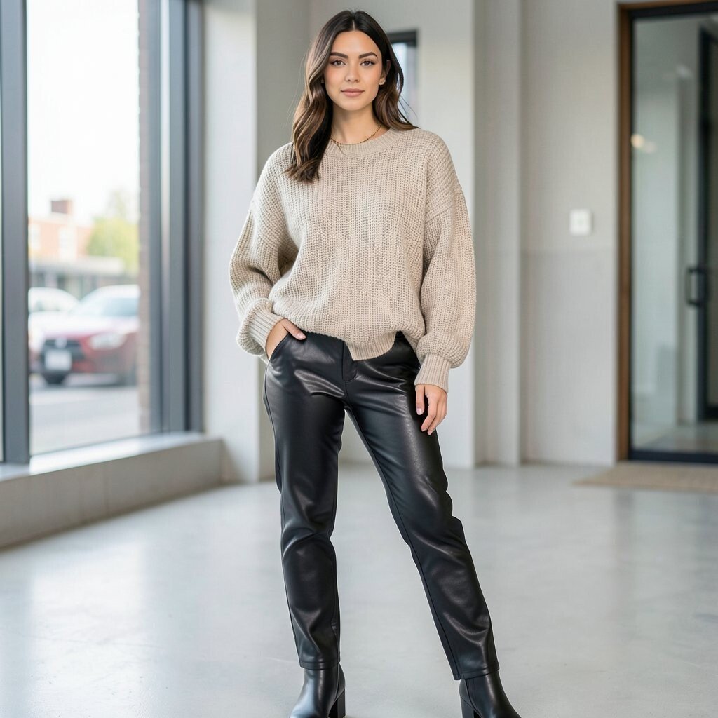 Combine the softness of a cozy sweater with the sleekness of leather pants for a balanced look. This is perfect for chilly days when you want to stay warm yet stylish. It’s a great way to add some texture and warmth to your ensemble.