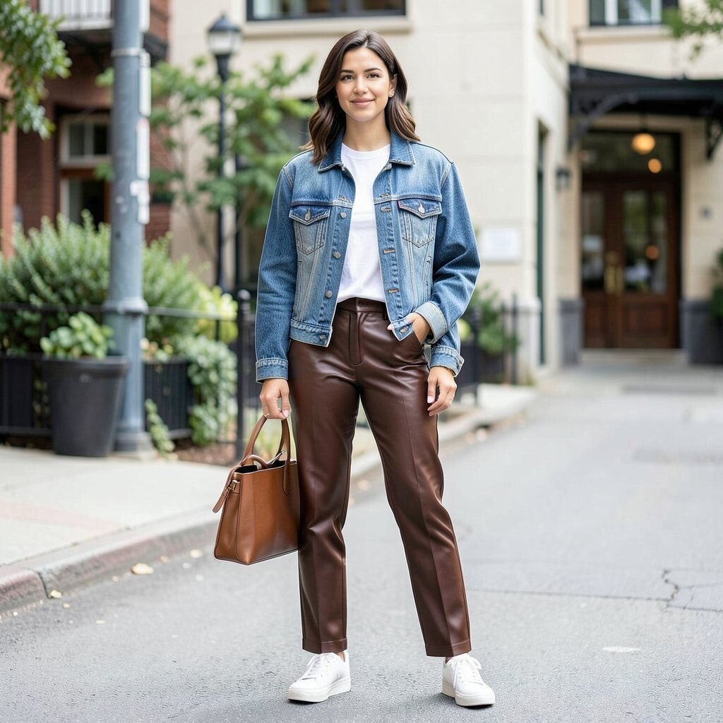 A denim jacket over leather pants creates a laid-back yet stylish vibe. It’s a perfect combo for a casual day out shopping or meeting friends. The mix of denim and leather offers a nice contrast that’s appealing and fun.