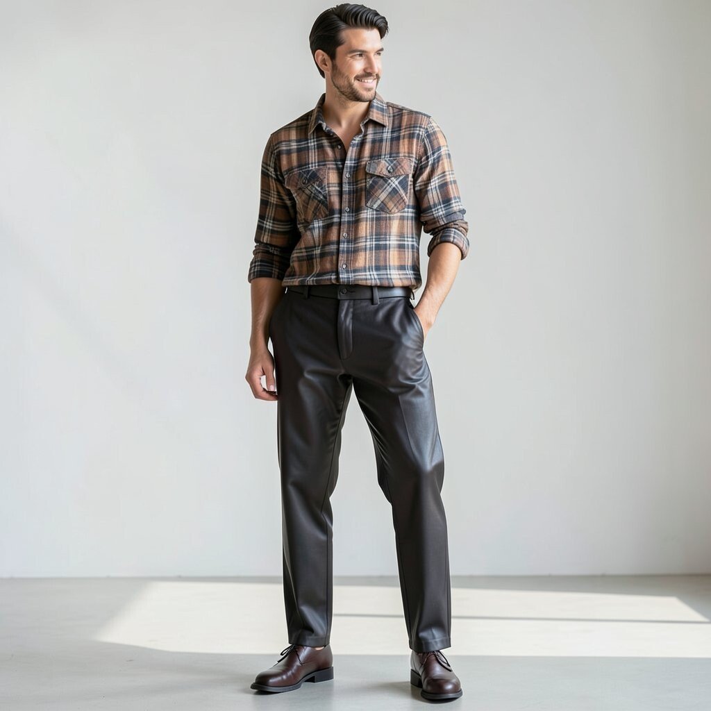 Embrace a relaxed vibe by pairing leather pants with a plaid shirt. This combination is perfect for casual days or weekend getaways. The plaid adds a touch of coziness and comfort to the look.