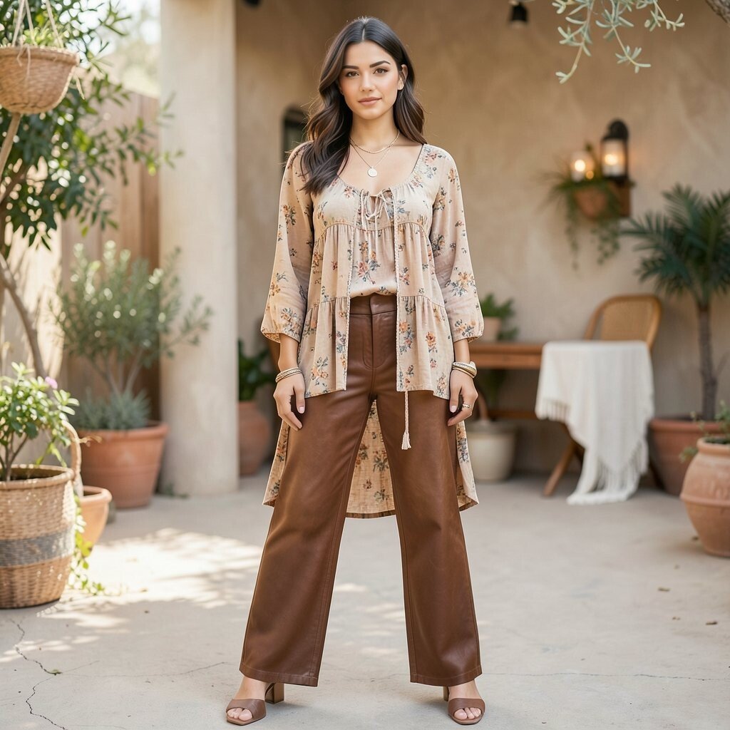 Embrace your bohemian side by pairing leather pants with a flowy tunic. This look is relaxed and perfect for festival-goers or a laid-back day out. The tunic adds movement and contrast to the structured pants.