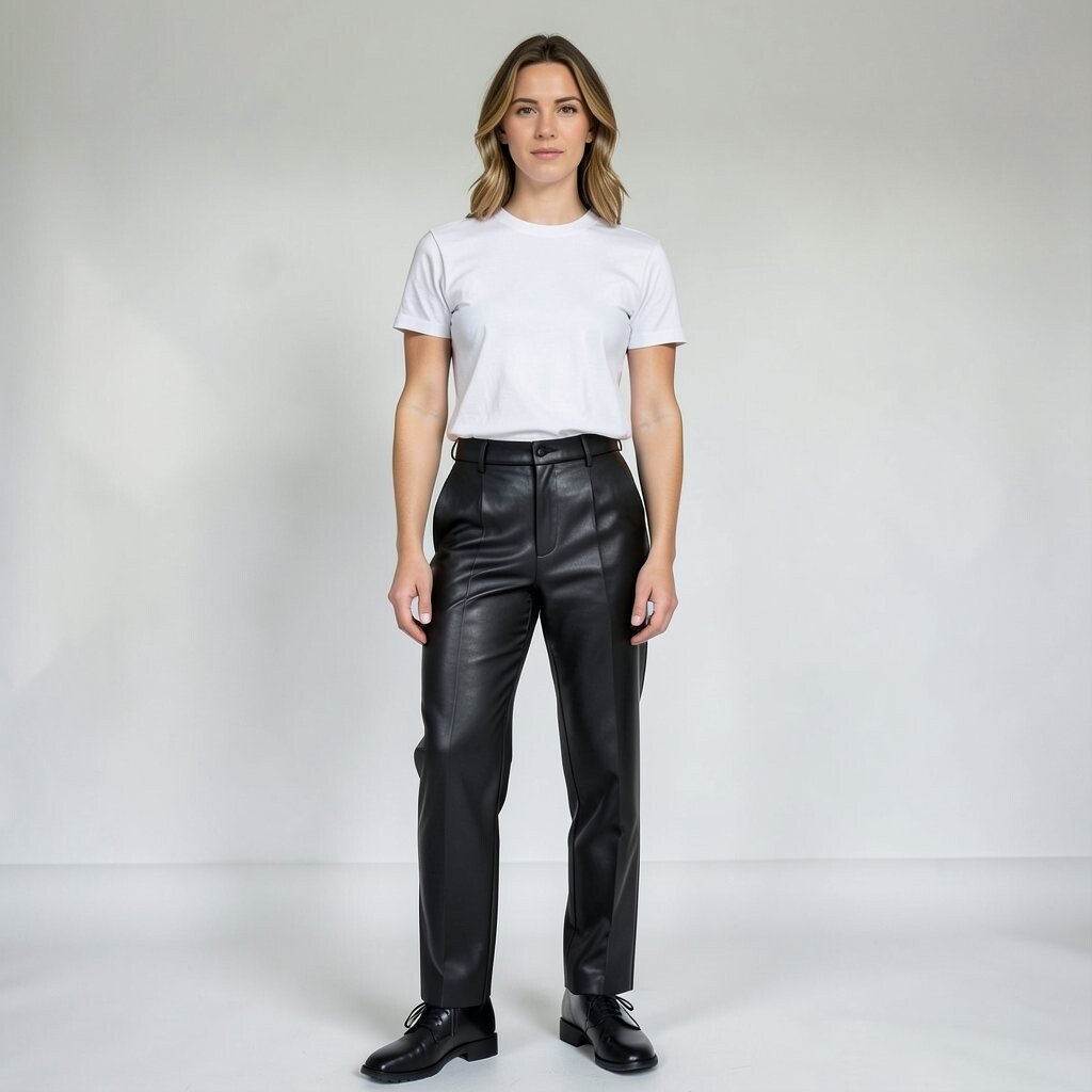 Pair classic black leather pants with a crisp white tee for a timeless look. This combination is effortlessly chic and always in style. It’s ideal for those days when you want to feel both comfortable and fashionable.