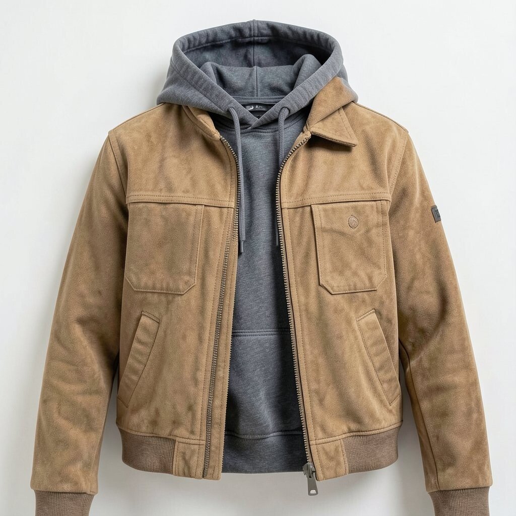 Layering a hoodie under a suede jacket is a great way to stay warm and stylish. This look is casual yet trendy, perfect for cooler weather.