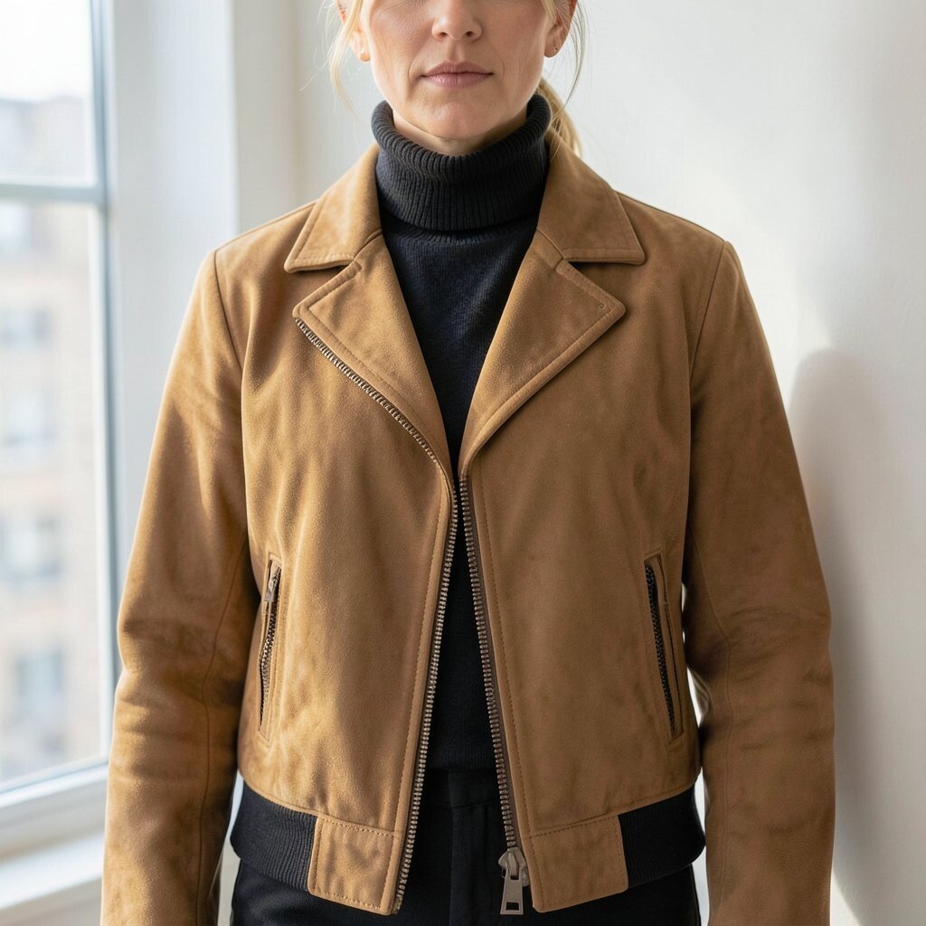 A suede jacket over a turtleneck is a classy and sophisticated choice. This ensemble is perfect for cooler days when layering is key.