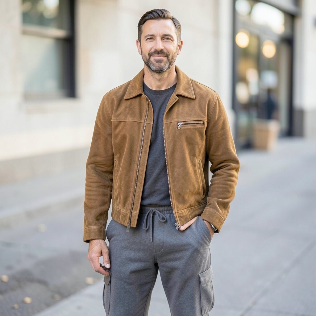 Combine a suede jacket with joggers for a stylish and comfortable outfit. This look is perfect for a casual day or running errands.