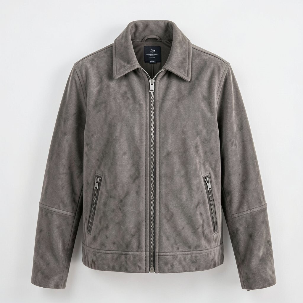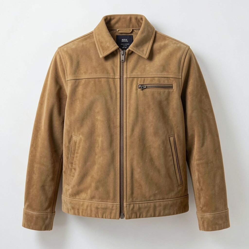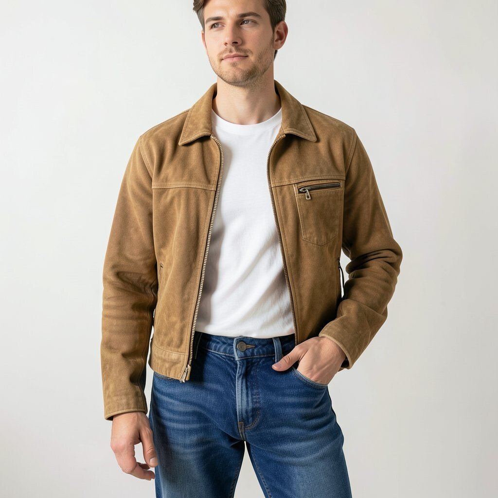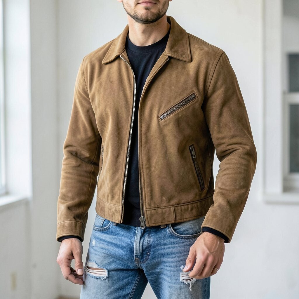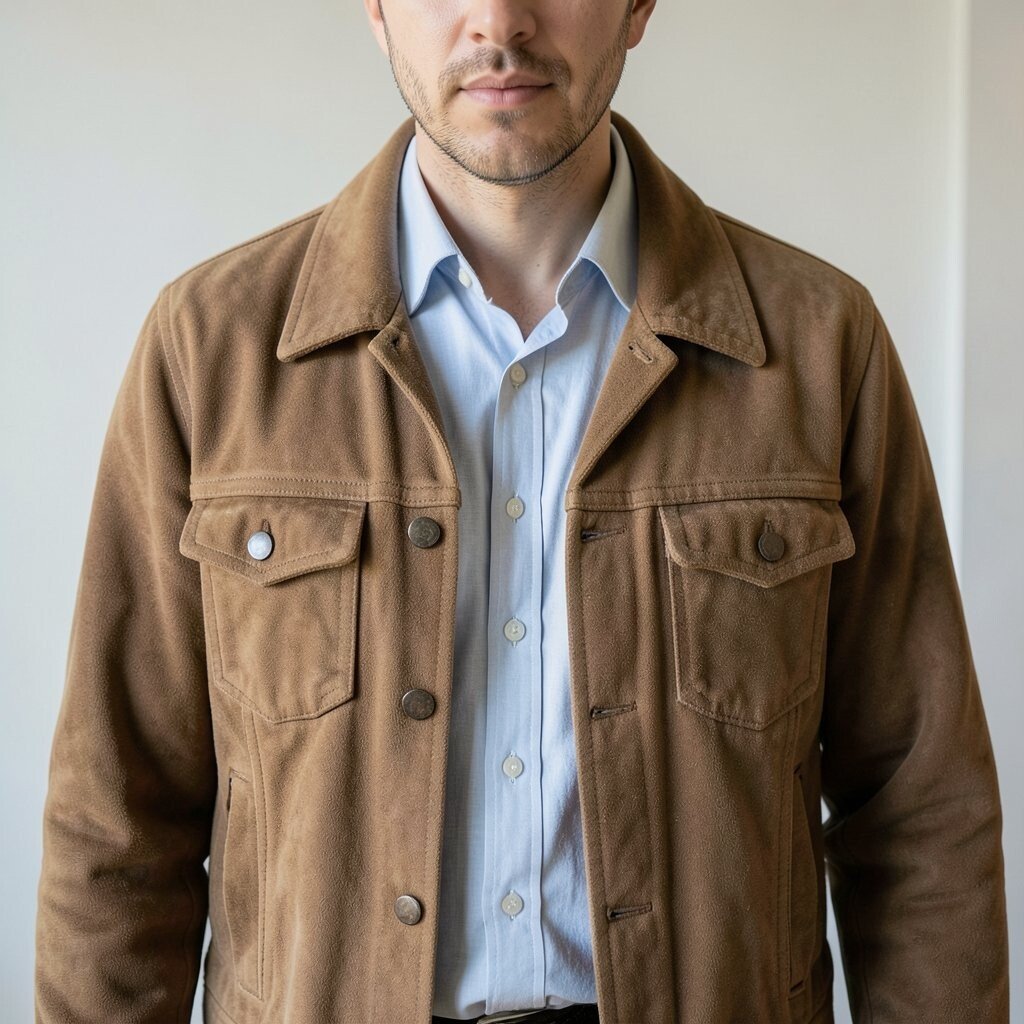A suede jacket worn over a button-up shirt offers a refined and sophisticated look. This outfit is perfect for work or a smart-casual event.