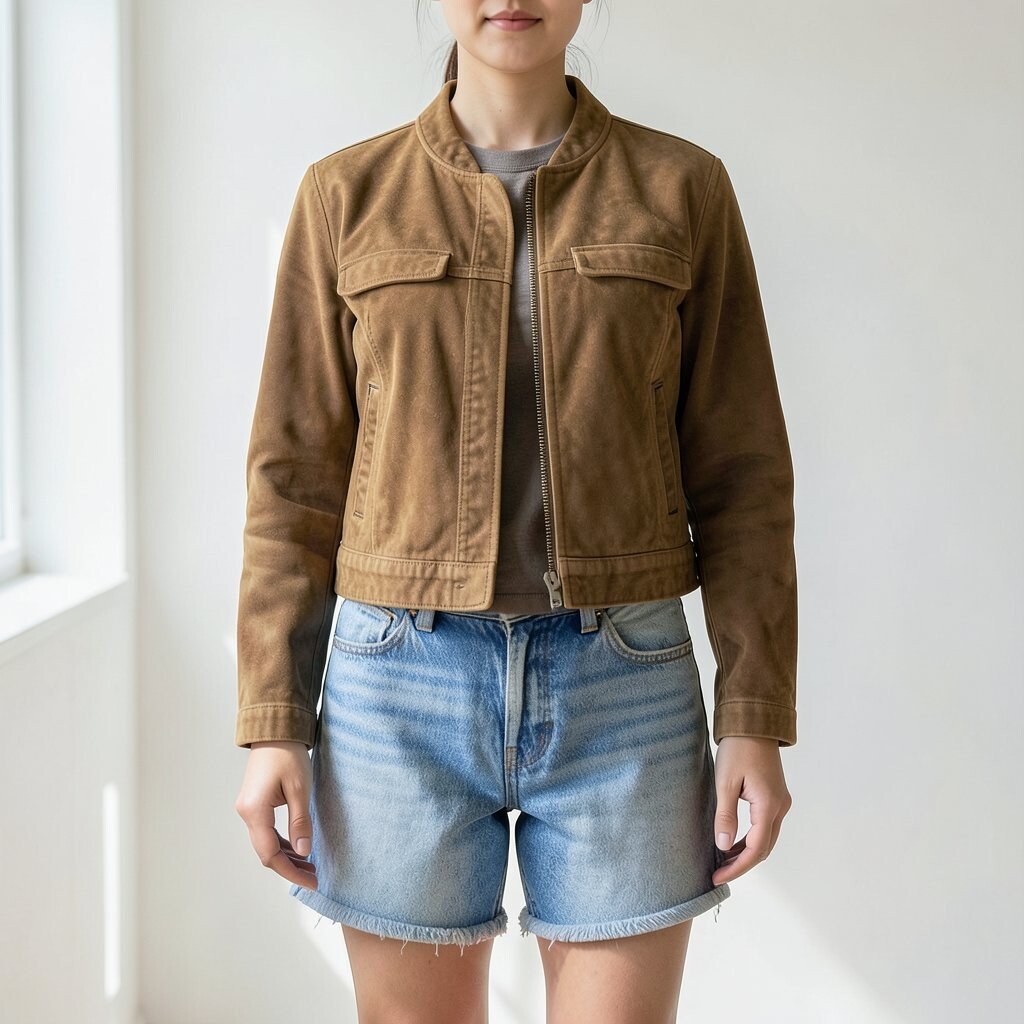 Pair your suede jacket with denim shorts for a casual and carefree look. This combination is great for a relaxed weekend outing.