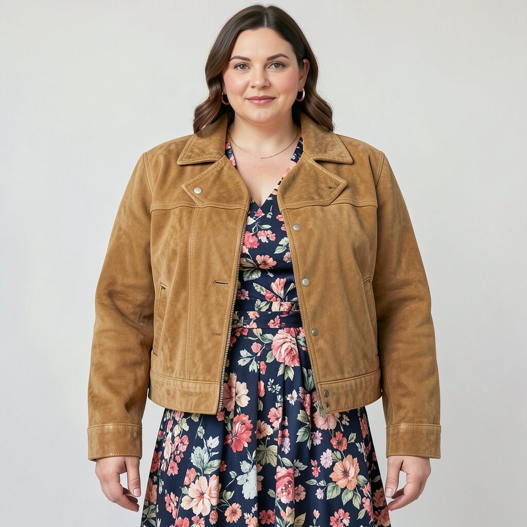 Incorporate ankle boots to complete this trendy ensemble. For a personalized touch, select a floral dress with complementary colors to your jacket. Suede jackets in neutral shades like tan or grey work best with colorful dresses.