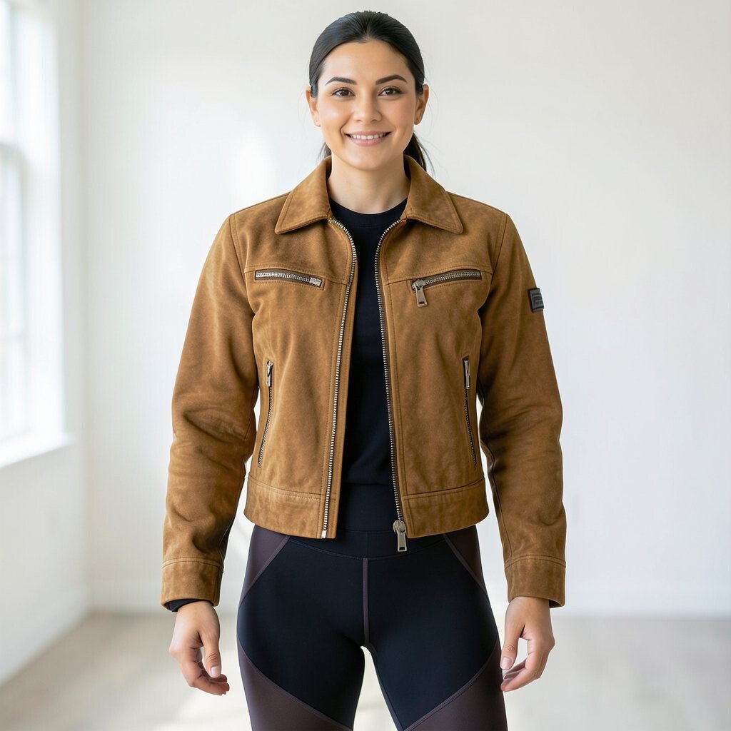 Pair your suede jacket with leggings for a sporty and stylish outfit. This combination is great for a casual and active day.