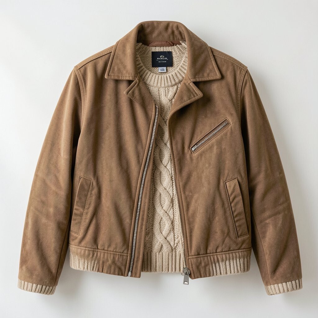 A cable knit sweater under a suede jacket creates a warm and stylish outfit. This combination is ideal for cold weather.