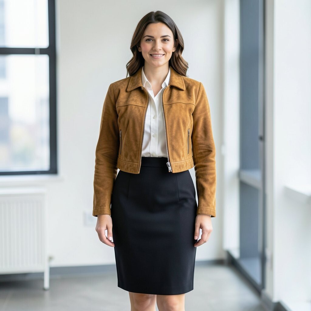 A suede jacket paired with a pencil skirt offers a chic and professional look. This outfit is perfect for the office or business meetings.