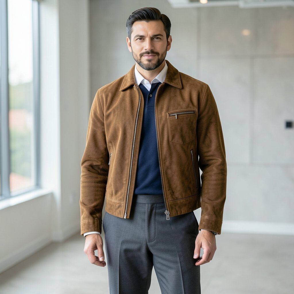 Pairing a suede jacket with slacks offers a professional and polished appearance. This outfit is ideal for business casual settings.