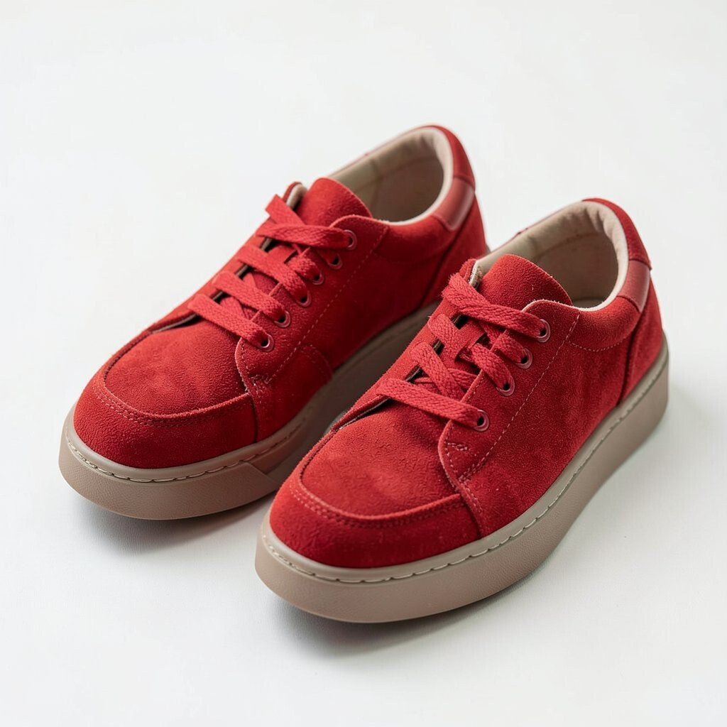Bold red suede sneakers are a statement piece. They can transform a simple outfit into something extraordinary.