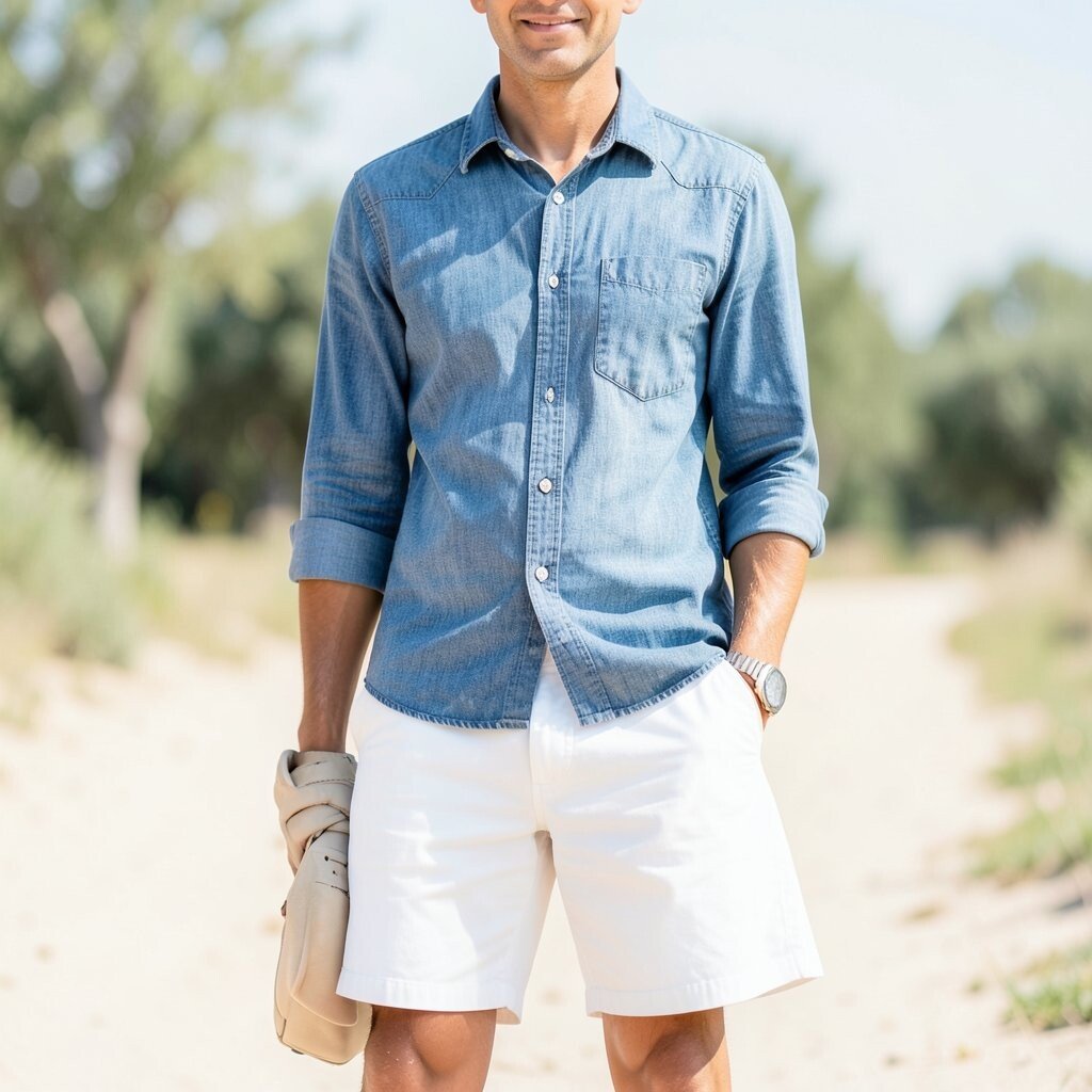 A chambray shirt paired with white shorts creates a fresh and clean summer look. This combination is perfect for a casual day out or a picnic.