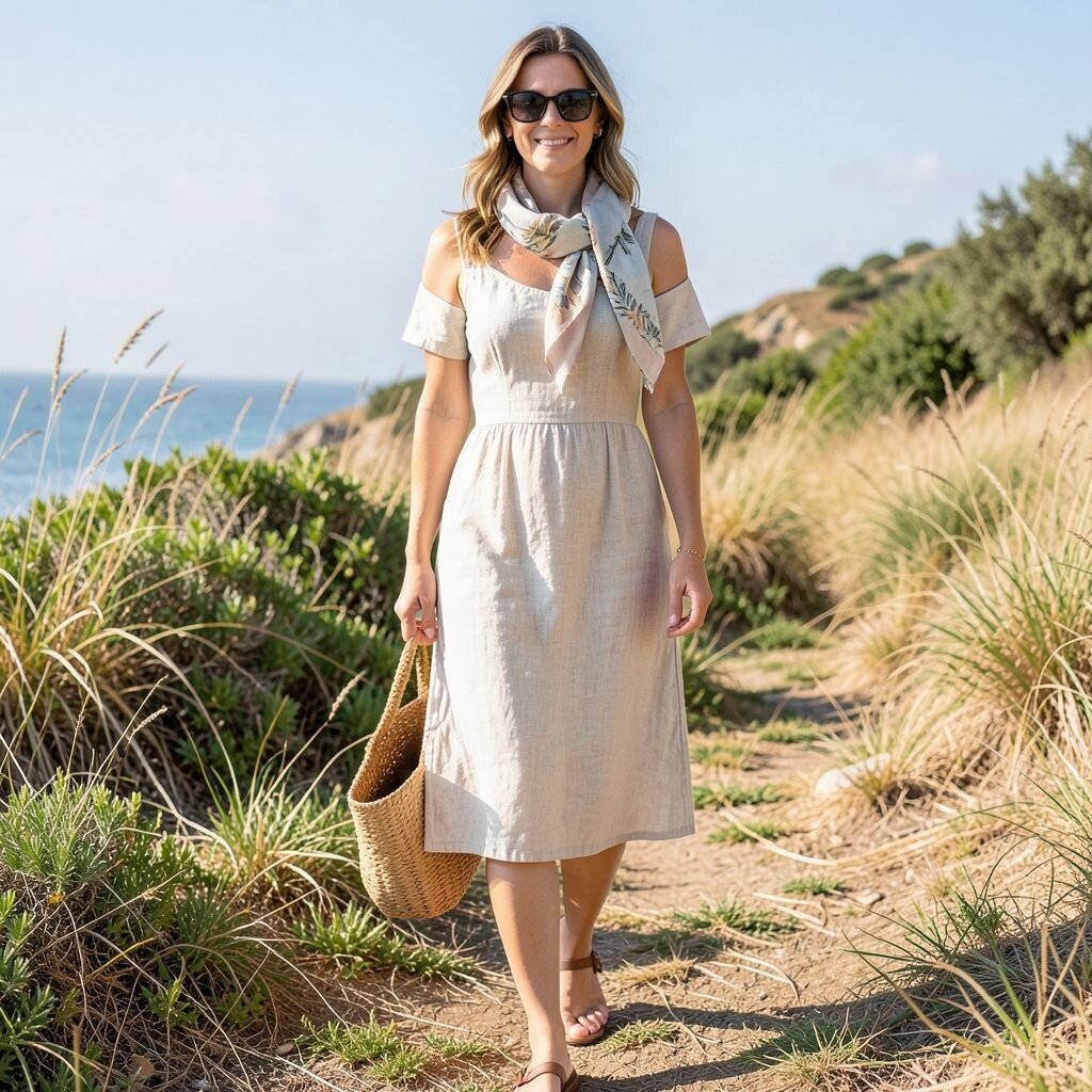 This combination is perfect for a day at the museum or a fancy dinner. Choose a scarf with a bold print or a classic pattern. Linen dresses are comfortable and timeless, making them a great investment piece.