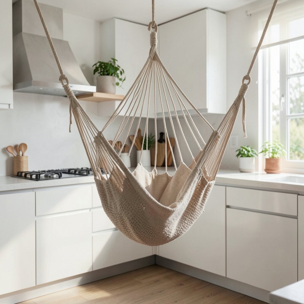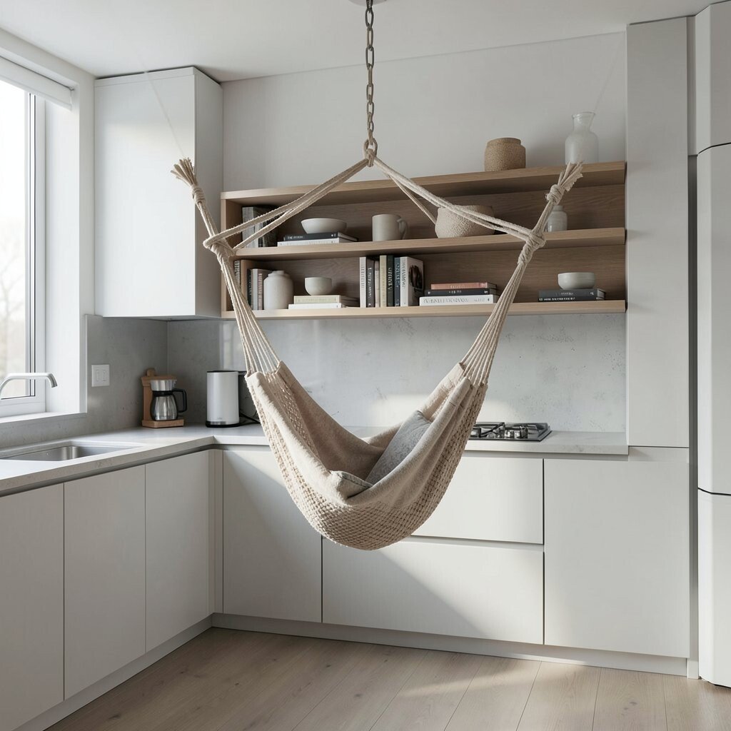 Picture a hammock made of thick, rustic rope, suspended from a simple wooden beam. This natural look blends seamlessly with a minimal kitchen’s clean lines and muted colors.