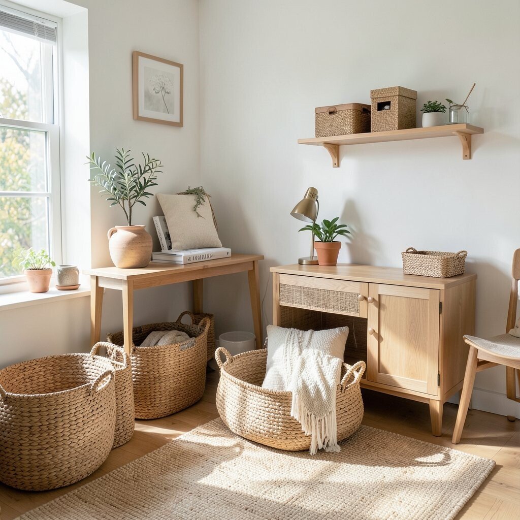 Woven seagrass baskets add texture that feels warm and natural. They hide clutter while still looking pretty on open shelves or under a bench.