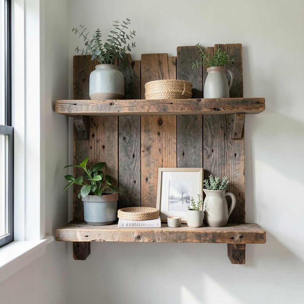A reclaimed wood shelf brings warm grain and old charm to a tiny wall. It gives you a place for books, plants, or a favorite mug without taking up floor space.