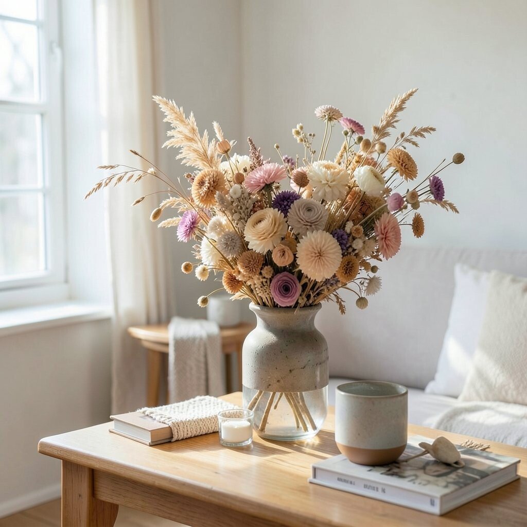 Dried flowers bring color and shape without needing water or daily care. They look lovely in a tiny apartment where fresh flowers may not last long.