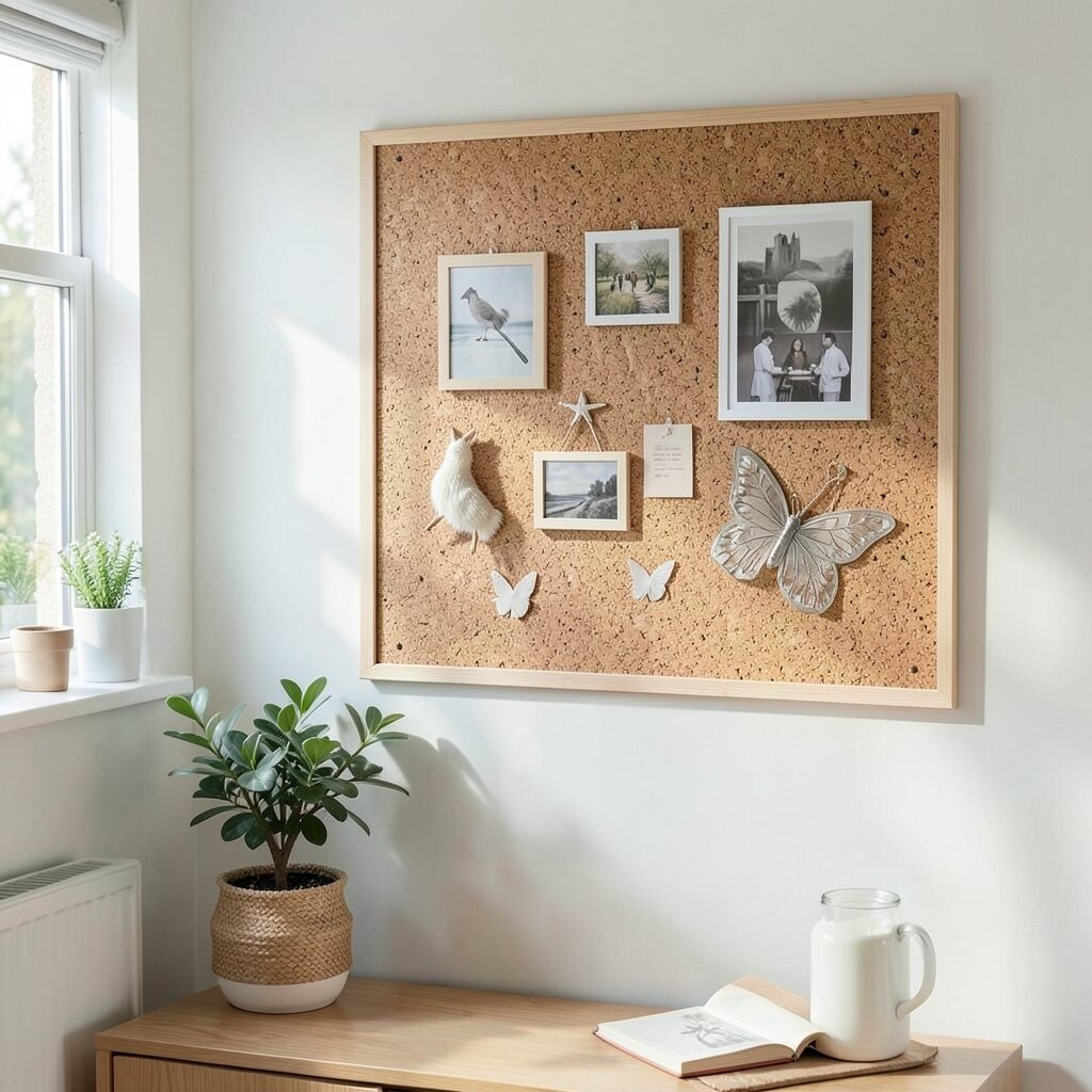 A cork board gives you a place for notes, photos, and little art prints. It keeps paper off counters and turns an empty wall into something useful.