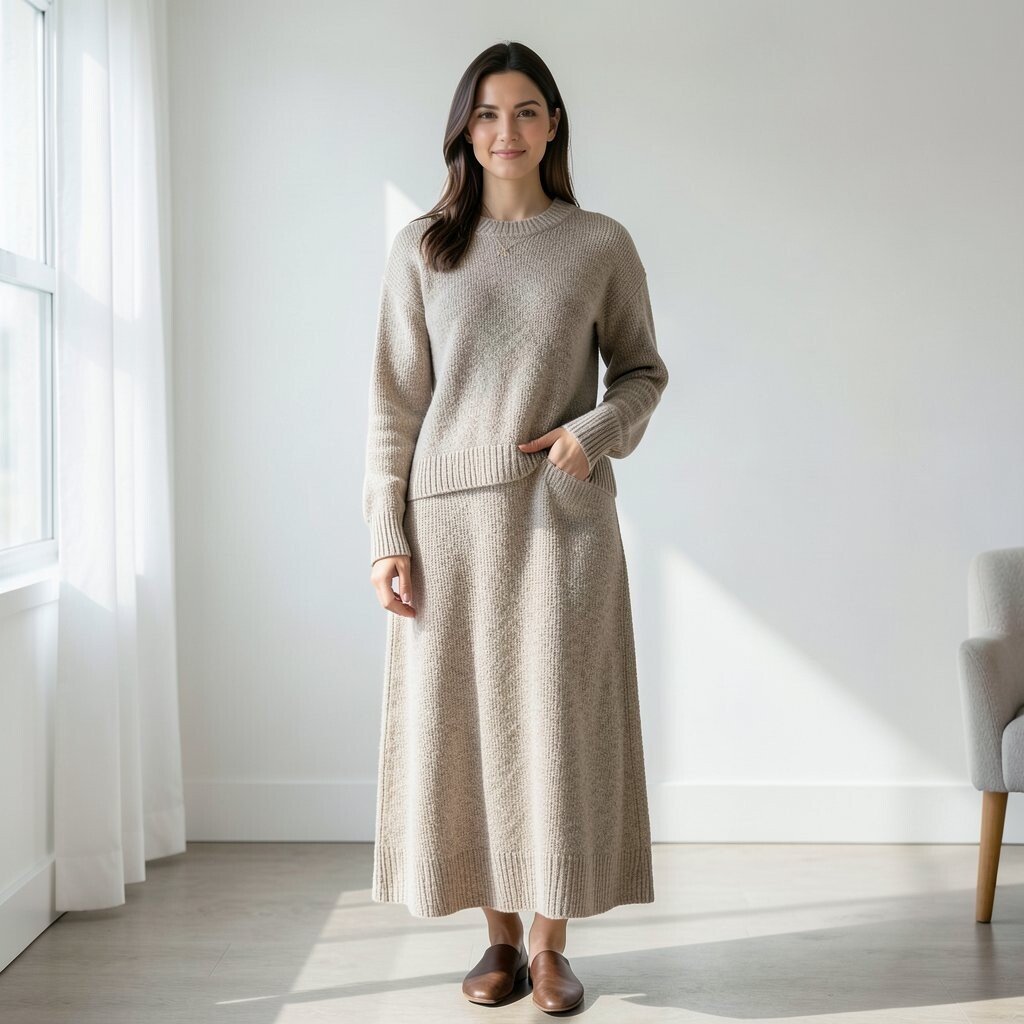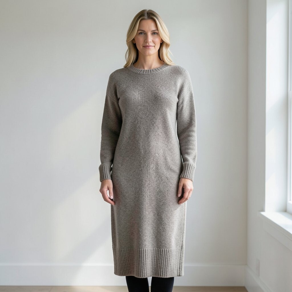 The midi sweater dress offers a balanced look, falling between knee and ankle. It’s a versatile option for various occasions.