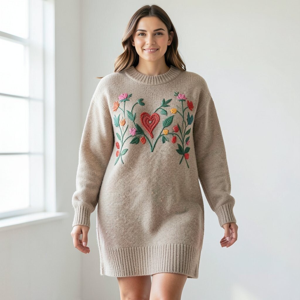 Embroidery adds intricate details to a sweater dress, making it a work of art. This design elevates the ordinary to extraordinary.