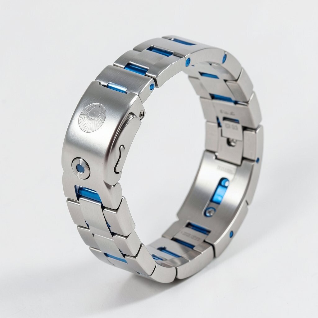 The polished titanium band with blue accents is a fresh take on the traditional watch strap. The blue touches add a pop of color, making it eye-catching.