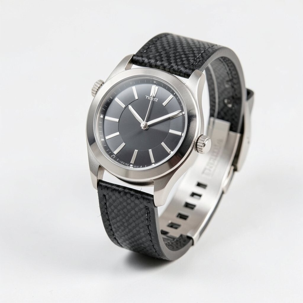 A titanium band with a carbon fiber inlay exudes modernity. The combination of materials offers a dynamic and sporty appeal.